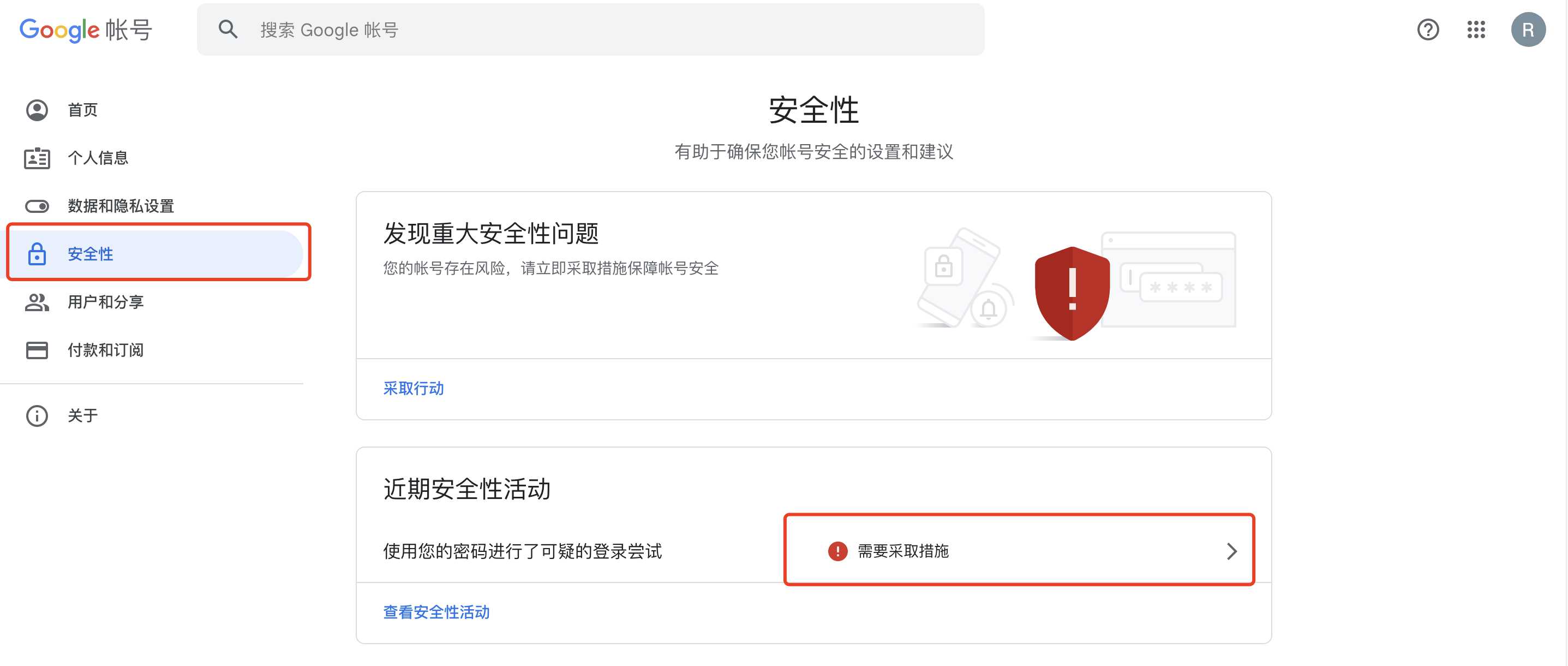 当账号登录成功后需要检查是否绑定辅助邮箱或者手机号,如果都没有绑定需要至少绑定其中一种以确保登录时谷歌能进行二级验证。同时账号的管理界面会有一条红色的阻止登录安全警报。并确认一下之前被阻止登录的记录为本人操作,以免再次出现同样的问题。